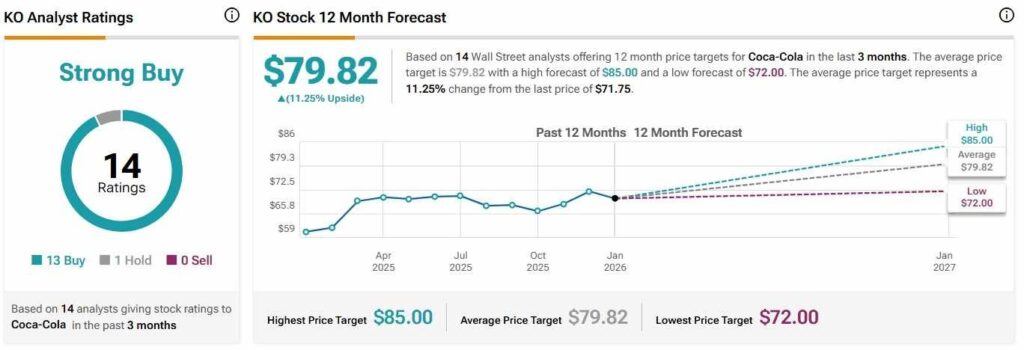 Looking forward, Wall Street is favorable toward KO equity, forecasting an 11.25%rise to $79.82 and considering it, on average, a ‘Strong Buy.’