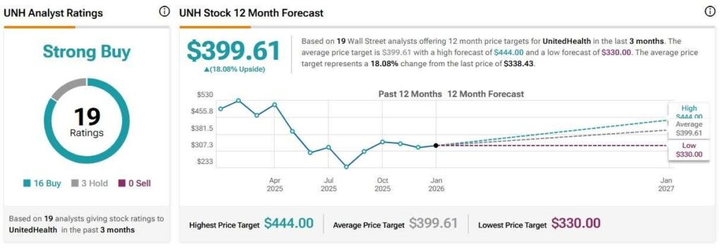 Looking ahead, Wall Street is optimistic about UnitedHealth stock and, on average, rates it as a ‘Strong Buy’ with a 12-month price target of $399.61, per the data Finbold retrieved from TipRanks on January 21.