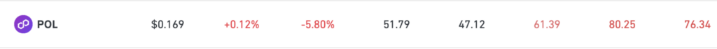 Starting with Polygon (POL), the token, priced at $0.169, has shown mixed performance in the immediate term, with a 5.8% decline in the past 24 hours. However, its RSI readings paint a clearer picture of the underlying momentum.