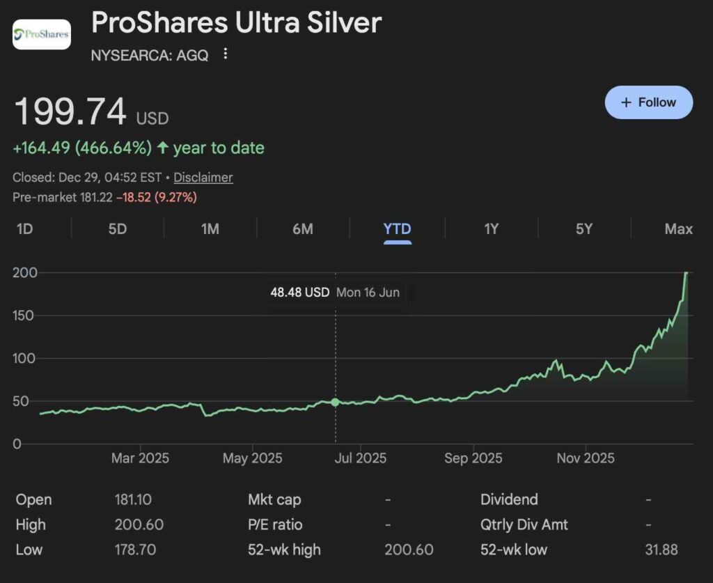 By press time, AGQ was valued at $199.74, having gained 40% over the week and a whopping 466% year-to-date.