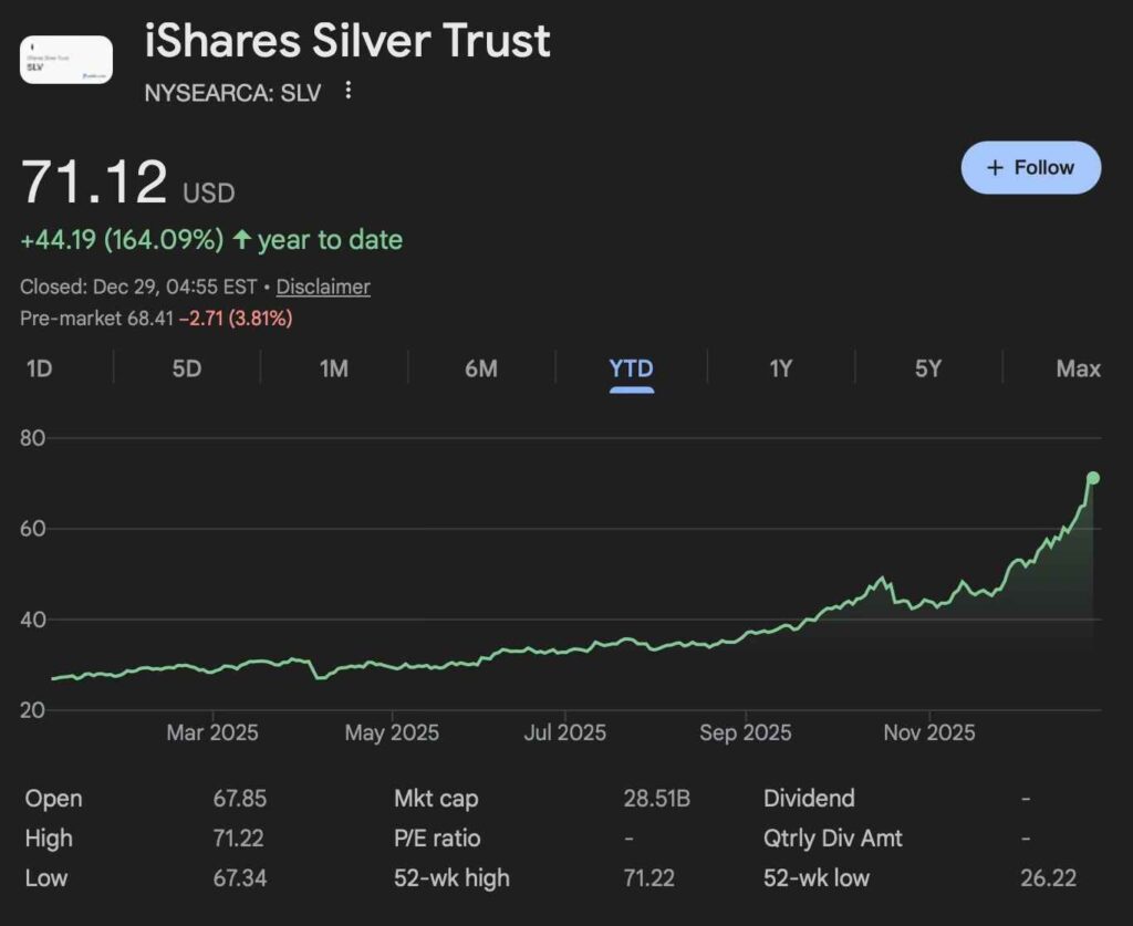 At the time of writing, SLV was at $72.12, up 19% on the week and no less than 164% on the year-to-date chart.