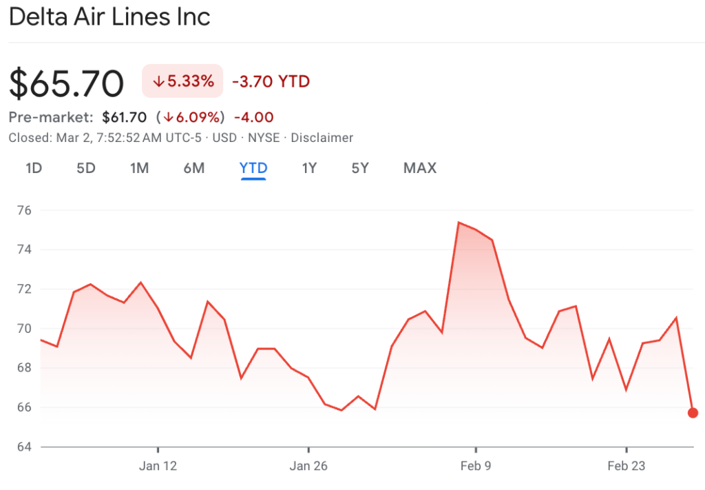 At the close of the last session, DAL shares ended at $65.70, down 6.8%. Year-to-date, the stock has fallen nearly 5%. In pre-market trading, Delta’s share price was down 6% to $61.
