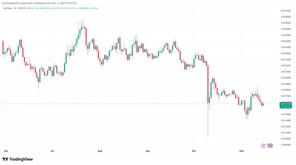 VET is currently trading below key moving averages, with a bearish price structure; however, the market sentiment remains indicative of an uptrend, as the $0.0150 support level continues to hold and the RSI is approaching oversold territory. If bulls defend this zone, analysts expect the beginning of a new accumulation phase similar to VET’s early 2021 pattern.