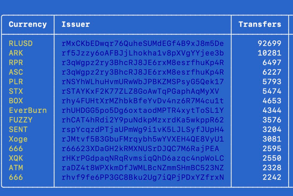 The rising use of stablecoins on the XRPL network significantly contributes to high-volume transfers. During the analyzed blocks, Ripple USD (RLUSD) accounted for 92,699 transfers. The ARK token recorded the second-highest transfers on the XRPL with about 10,281.