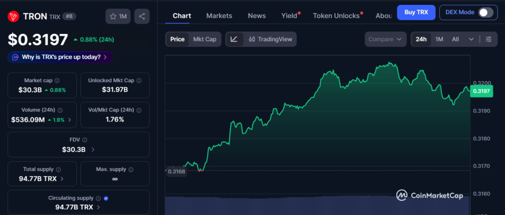 The importance of TRON lies in its efficiency and scalability. This platform is considered to be one of the cheapest platforms that features extremely fast transaction times. TRON is currently trading at $0.3197 with a good-performing chart. It has a market cap of more than $30 billion and a 24-hour trading volume of $536.09. TRON is becoming increasingly popular since it is often used as a gateway for stablecoin swaps, thus featuring a high amount of transactions.
