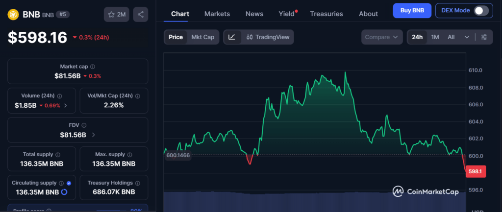 What distinguishes BNB from other cryptocurrencies is the fact that it uses an ecosystem that is among the largest within the crypto industry. Currently trading at $598.16 with a slight decline in its overall performance in the charts. It has a market cap of more than $81 billion and a 24-hour trading volume of $1.85 billion. The original purpose behind developing BNB was to use it for paying exchange transaction fees, but today, BNB tokens are also used to pay for transactions, DeFi applications, and smart contract fees.