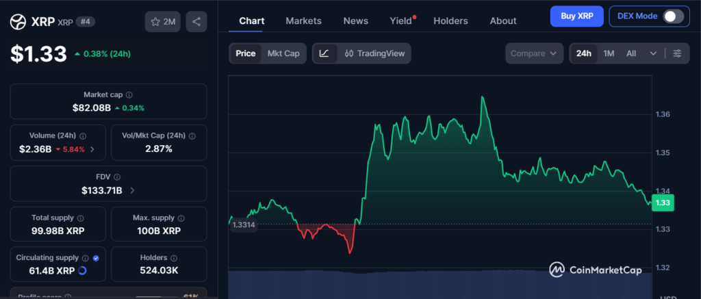 XRP is one of the most commonly used coins due to the facility of transferring money internationally at a fast rate with low costs. The token is currently trading at $1.33 and has a market cap of $82.08 billion. The 24-hour trading volume has seen a decline of 5%, with keeping up a $2.36 billion in transactions. XRP was invented for faster cross-border transactions.