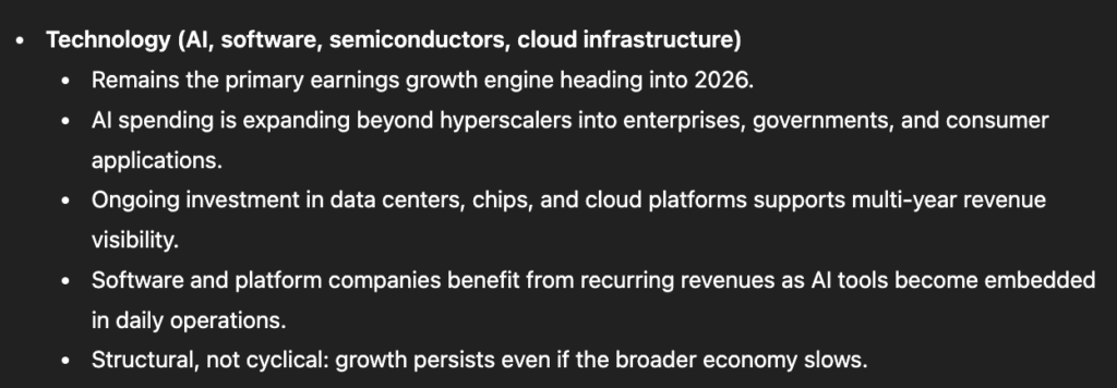 ChatGPT noted that several technology subsegments are advancing in parallel, including AI-focused semiconductors, software platforms monetizing AI through subscriptions and enterprise solutions, and cloud and data infrastructure supporting increasingly digital operations.