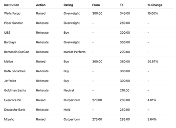 Evercore ISI nudged its target from $270 to $283, and Mizuho lifted its target from $275 to $285, On the other hand, Bernstein SocGen, taking a more cautious approach, maintained its Market Perform rating with a target of $200.