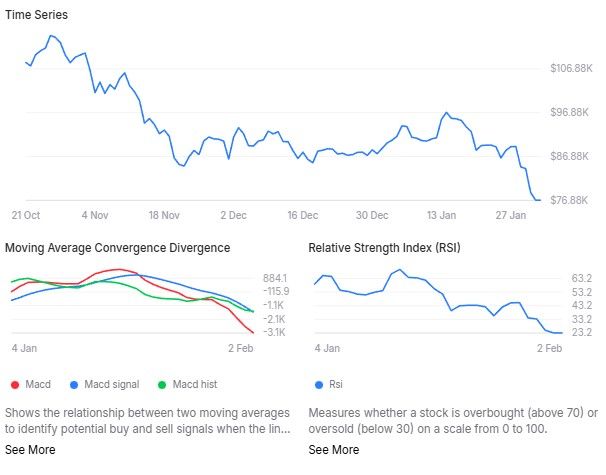 The asset has broken below key weekly support levels, including the critical 200-day Simple Moving Average (SMA) of $103,947, while the 14-day Relative Strength Index (RSI) reads 23.37, indicating deeply oversold conditions and weak momentum.