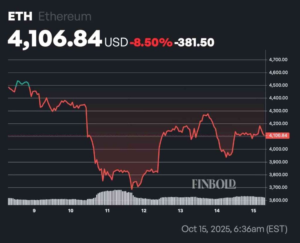 As of press time, ETH was trading at approximately $4,106, having gained some 3% in the past 24 hours. However, on the weekly chart, the token is still down 8.50%.