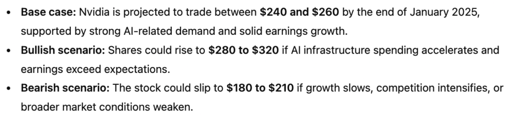 Overall, ChatGPT’s point estimate centers around $250 by January 31, 2025, balancing Nvidia’s strong fundamental growth drivers against the risks tied to elevated valuations and shifting market sentiment.