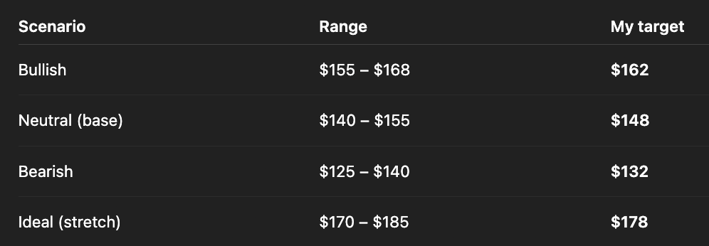 Conversely, a bearish outlook points to a pullback toward $125–$140, with a central estimate of $132, driven by valuation pressure, profit-taking, or weaker sentiment, likely resulting in a gradual decline with occasional sharp drops.