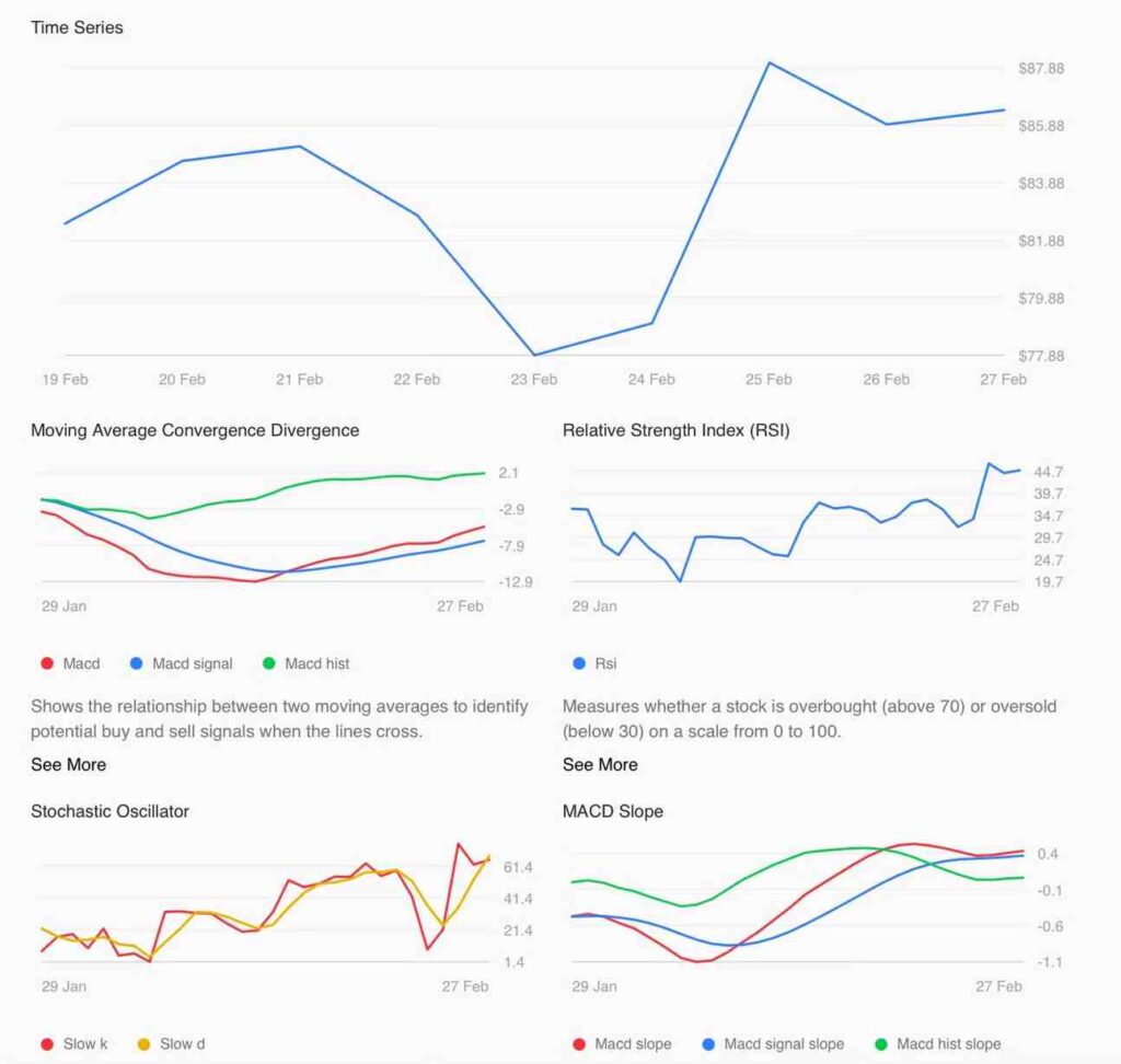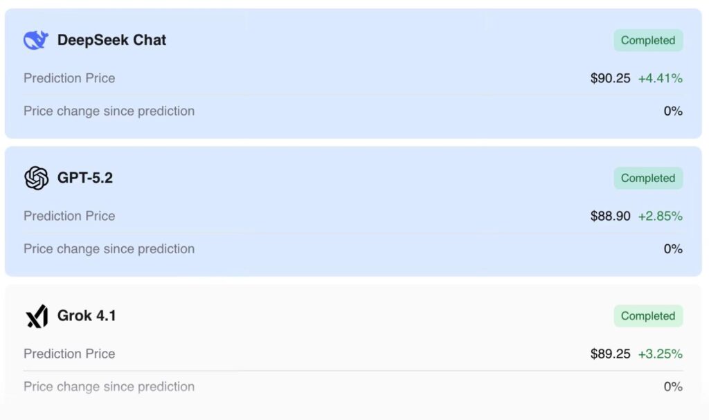 DeepSeek Chat forecasts the highest price at $90.25, a possible 5.45% advance. ChatGPT sees it climbing 2.85% to $88.90, while Grok calls for a 3.25% gain and a price of $89.25.