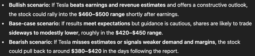 If Tesla delivers an earnings beat alongside stable or improving margins and a constructive outlook, the stock could trade higher in the days following the report, potentially moving into the $460 to $500 range as investors respond to renewed confidence.