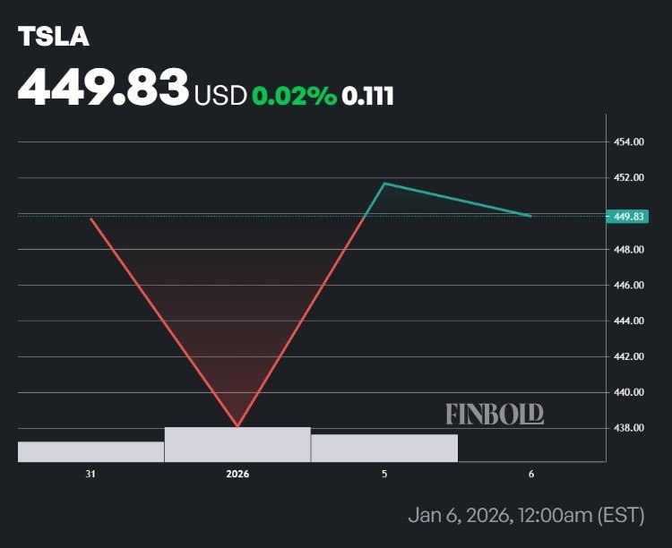 After a strong finish to 2025, which saw an almost uninterrupted rally from late November through late December, Tesla shares pulled back at the start of the new year. The TSLA stock fell from $449.72 to $438.07 on January 2 before rebounding to a closing price of $451.67.