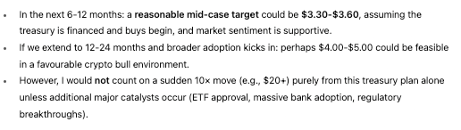 However, the AI cautioned against overly bullish expectations, noting that a dramatic surge to $20 or higher would likely require major additional catalysts, such as ETF approvals, large-scale banking adoption, or significant regulatory breakthroughs.