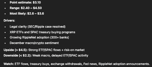 By considering these factors, ChatGPT predicts that XRP will be valued at approximately $3.10 on December 25, with an expected range between $2.40 and $4.50. The most likely price will sit between $2.60 and $3.60.