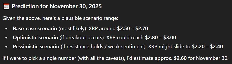 Accordingly, ChatGPT believes XRP is most likely to trade around $2.50–$2.70 by November 30. In a more optimistic scenario, that is, if the token manages to break out above $2.70, it could reach the $2.80–$3.00 range.