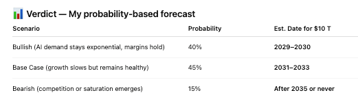 According to ChatGPT’s projection, Nvidia would need to compound its valuation by roughly 15% to 20% annually over the next five to seven years to reach the milestone. While that pace may seem ambitious, it remains attainable if the global AI investment boom continues at its current trajectory.