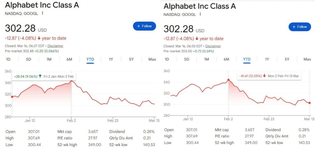 Google stock price YTD chart with performance to and since February 2 highlighted. Source: Google