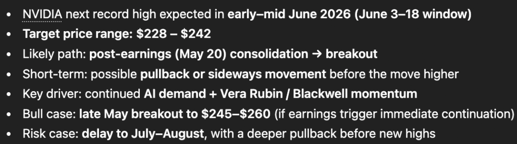It identified the May 20 earnings report as the key catalyst. Even with strong results, considered likely, it expects a brief “sell-the-news” or sideways phase of up to 10 days, followed by a second rally as institutions reposition, putting a breakout two to four weeks after earnings.