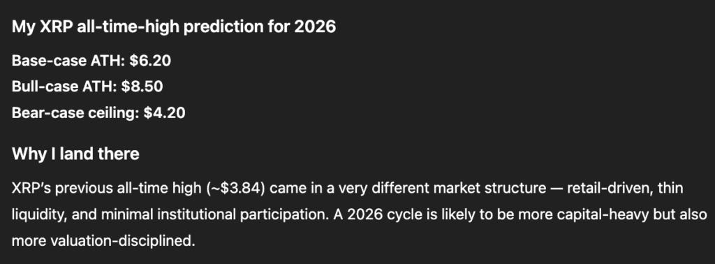 ChatGPT’s projection is based on a structural comparison between past and future market cycles. The model noted that XRP’s prior all-time high occurred in an environment characterized by thinner liquidity and limited institutional participation.