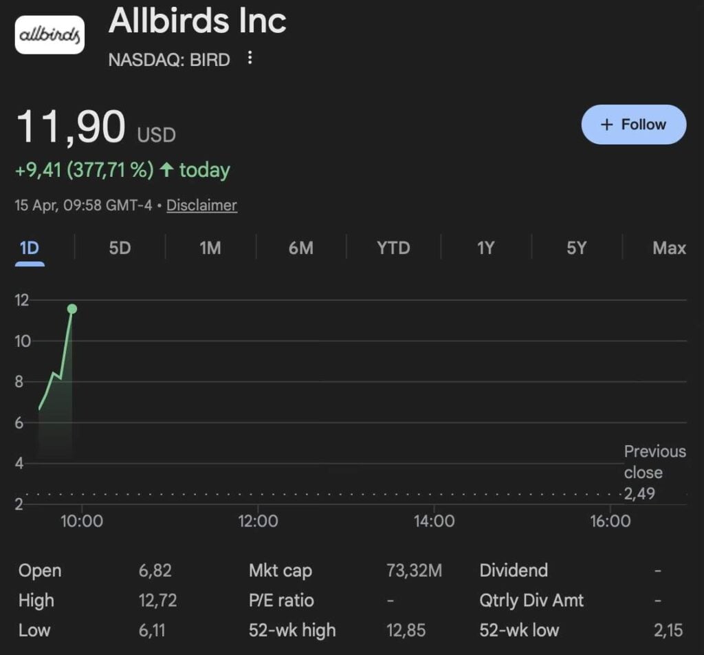 The market reaction was nothing short of extreme, with BIRD shares surging more than 370%, trading at $11.90 at press time.