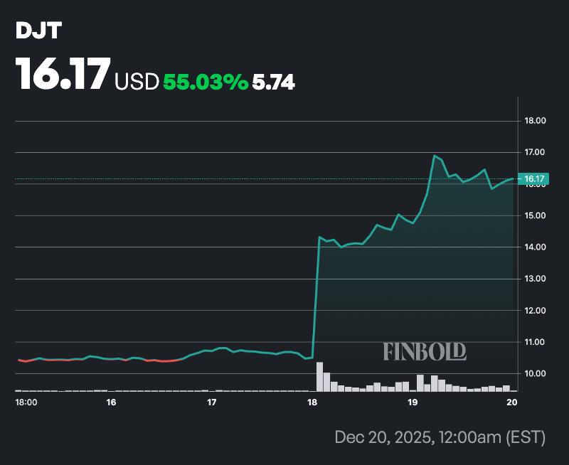 Market reaction to the fusion announcement has been volatile, with DJT shares experiencing sharp gains following the news. At the close of Friday’s session, DJT was trading at $16.09, ending the day up more than 8%. Over the past five days, the stock has rallied by over 50%.