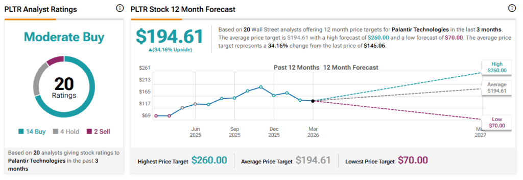 As a result of this week’s analysis notes, the average Palantir stock price target for the next year now sits at $194.61. That is, a total of twenty analysts see the stock rallying 34.16% from the current levels, according to TipRanks data.