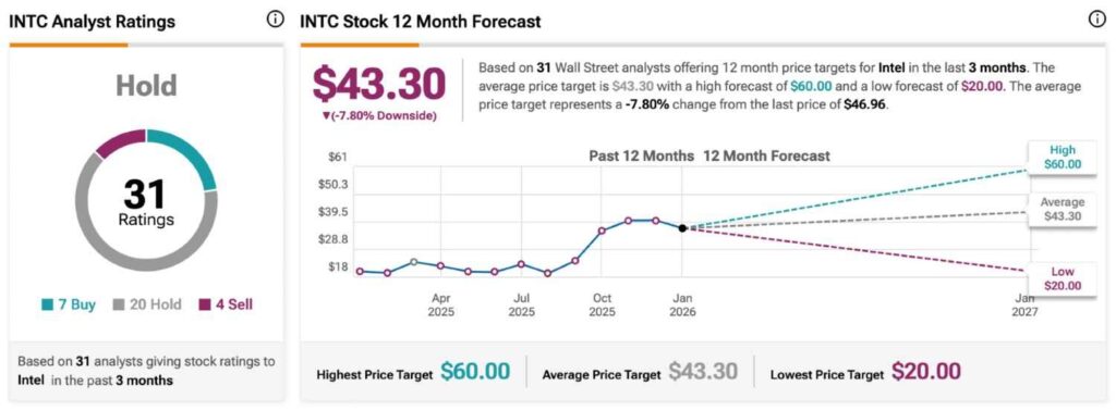 Nonetheless, while the most recent revisions have been broadly positive, the average INTC stock price target remains somewhat weak for the next 12 months. Namely, according to a total of 31 ratings analyzed on TipRanks over the past three months, the average Intel price forecast this year sits at just $43.30.