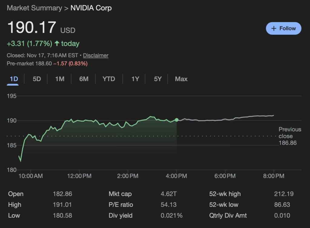 At the time of writing, Monday, November 17, Nvidia stock was trading at $188.60, down 0.83% in pre-market.