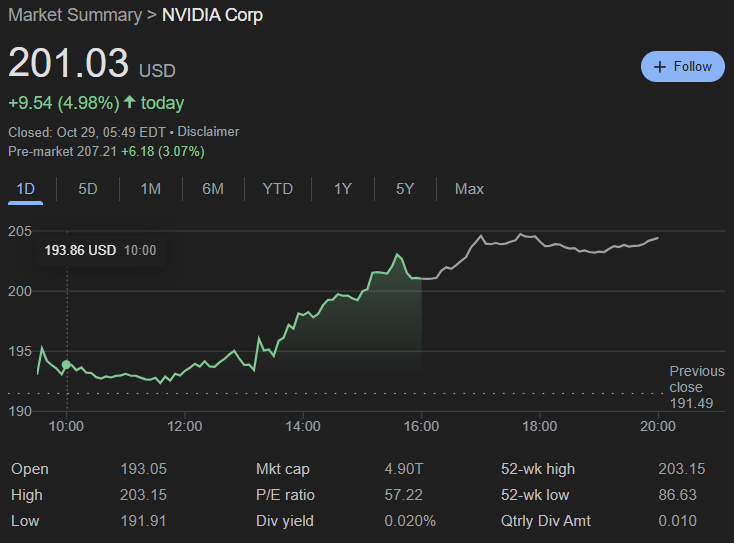 As a result, Nvidia shares broke past $200 for the first time in history, closing nearly 5% in the green on Tuesday, October 28, and gaining another 3.2% in pre-market on Wednesday, October 29, when it traded at $207.21 at the time of writing.