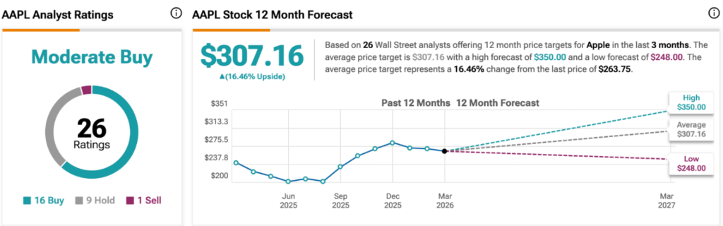 According to data compiled by TipRanks, Apple holds a ‘Moderate Buy’ rating based on 26 analysts. Of those, 16 recommend buying the stock, nine suggest holding, and one advises selling.
