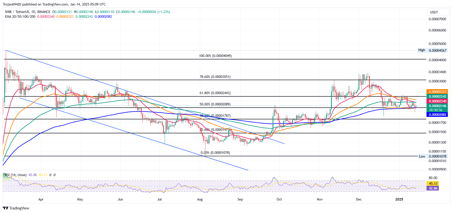 Shiba Inu is trading slightly above its 200-day EMA at $0.000021 after retesting its $0.000019 support level on Monday. This level coincides with its 61.8% Fibonacci retracement, a critical reversal zone drawn from its August 5 low of $0.000010 to its December 8 high of $0.000033.