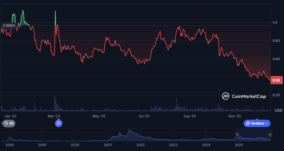 Cardano’s price history tells a clear story. During the previous bull cycle, ADA peaked around $1.25. In the cycle before that, it reached roughly $3.10. Failing to reclaim even half of its former high during the most recent market expansion has raised questions about development velocity, adoption, and relevance.