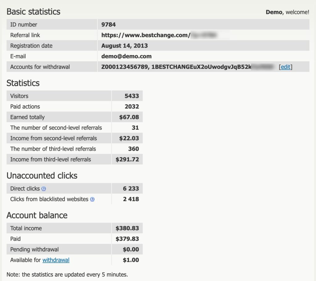 The referral program is supported by a comprehensive personal account that gives participants full visibility into their performance. Within the account, partners can track: