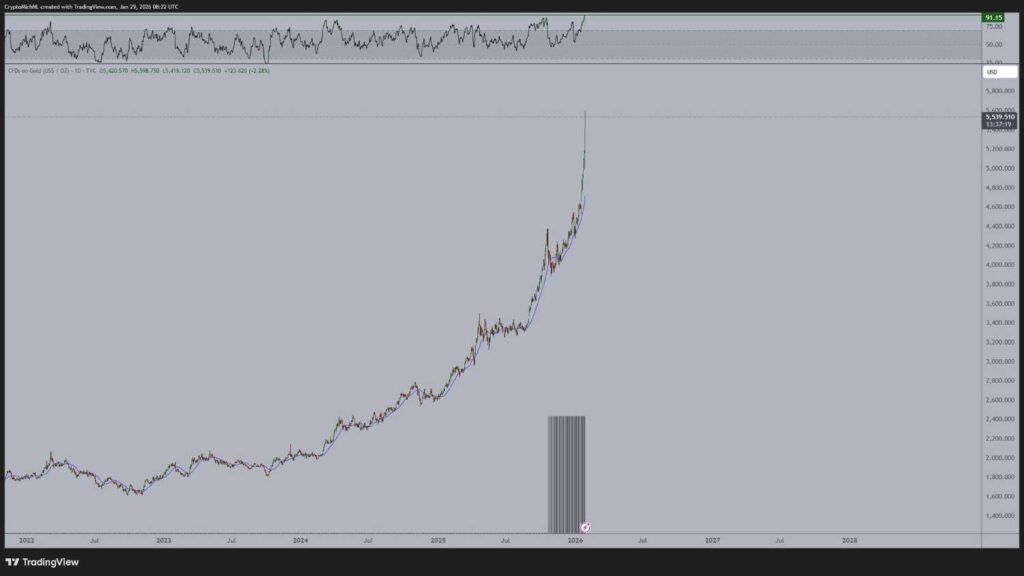 According to Michaël van de Poppe, macro market expert and crypto trading analyst, the current gold setup is historically extreme and could have implications for Bitcoin.