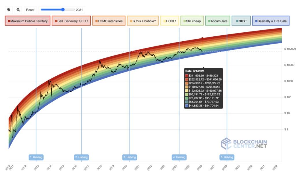 For March 1, the lowest band, ‘Basically a Fire Sale,’ ranges from $41,882 to $54,704 and signals extreme undervaluation where long-term investors have historically stepped in aggressively.