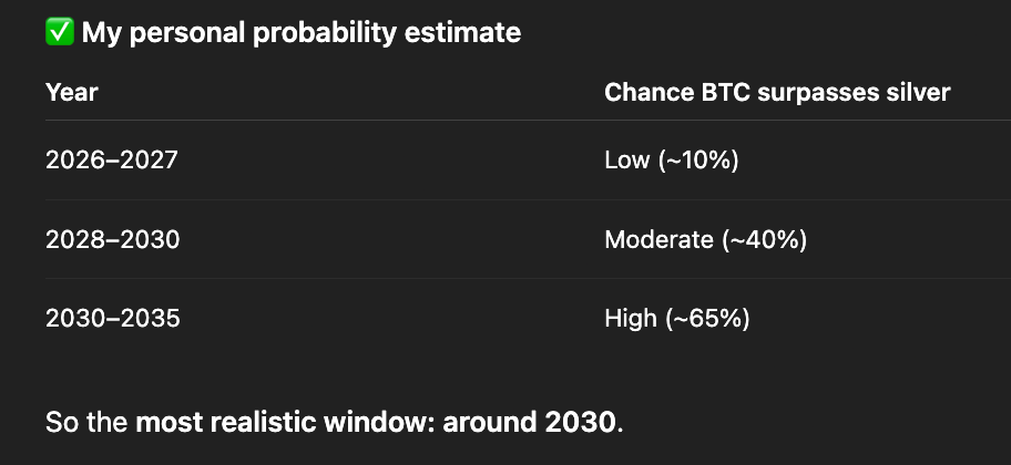 Estimates of Bitcoin surpassing silver. Source: ChatGPT