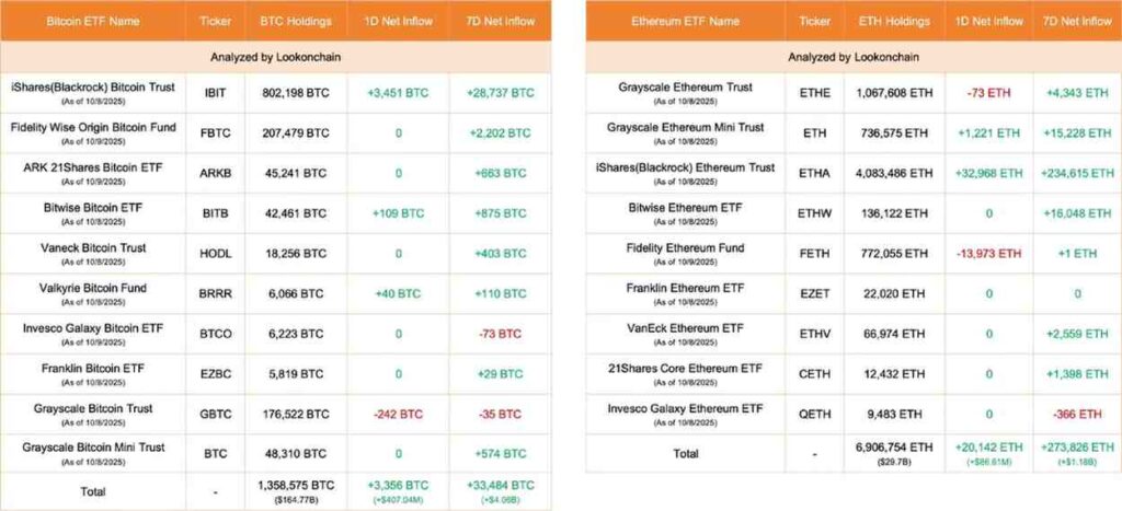 Crypto exchange-traded funds (ETFs) recorded strong inflows on Thursday, October 9, with both Bitcoin (BTC) and Ethereum (ETH) posting notable gains.