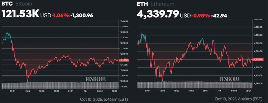 BTC is sitting at $121,530, down 1.06%, while ETH is trading at $4,339, having slipped 0.98%.