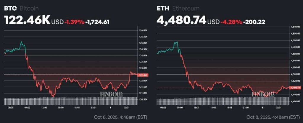 Bitcoin fell 1.39%, trading at $122,460 at the time of writing, down from its Monday all-time high of $126,198. Ethereum, on the other hand, has plunged over 4%, sitting at $4,480.