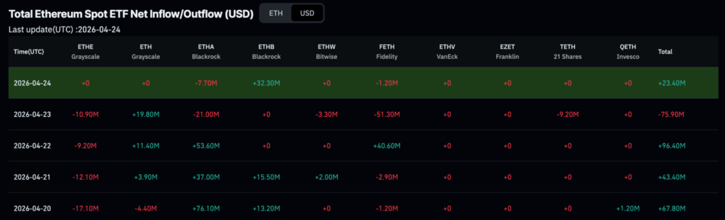 April 22 extended the positive trend with $53.6 million in inflows. However, the sequence was interrupted on April 23, when the funds recorded a net outflow of about $21 million, before rebounding on April 24 with a net gain of $24.6 million.