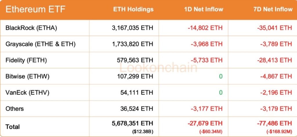 As a result, ETHA investors have sold 35,041 ETH, during the past seven days, worth about $75.12 million. This fund currently holds 3,167,035 ETH, which has a notional value of $6.79 billion.
