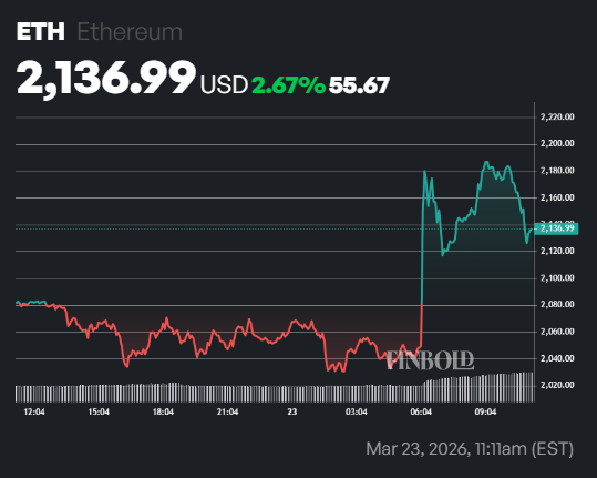 Similarly, Ethereum price jumped 2.67% in the past 24 hours to trade at about $2,136 on Monday.