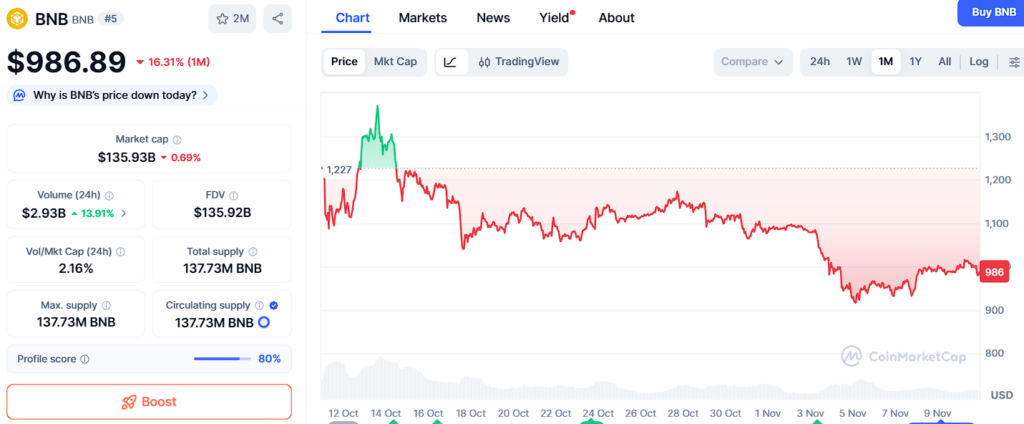 Crypto markets are heating up as large-cap property like Binance Coin (BNB) pushes towards new highs. Currently trading around $986, BNB remains one of the strongest and most trusted tokens in the market, backed by Binance’s great surroundings and expanding application.