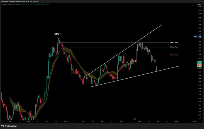 Meanwhile, insights from pseudonymous analyst STASHER, shared in an X post on October 8, show that Cardano continues to trade within a broad ascending channel but remains in a corrective phase since its 2021 peak.