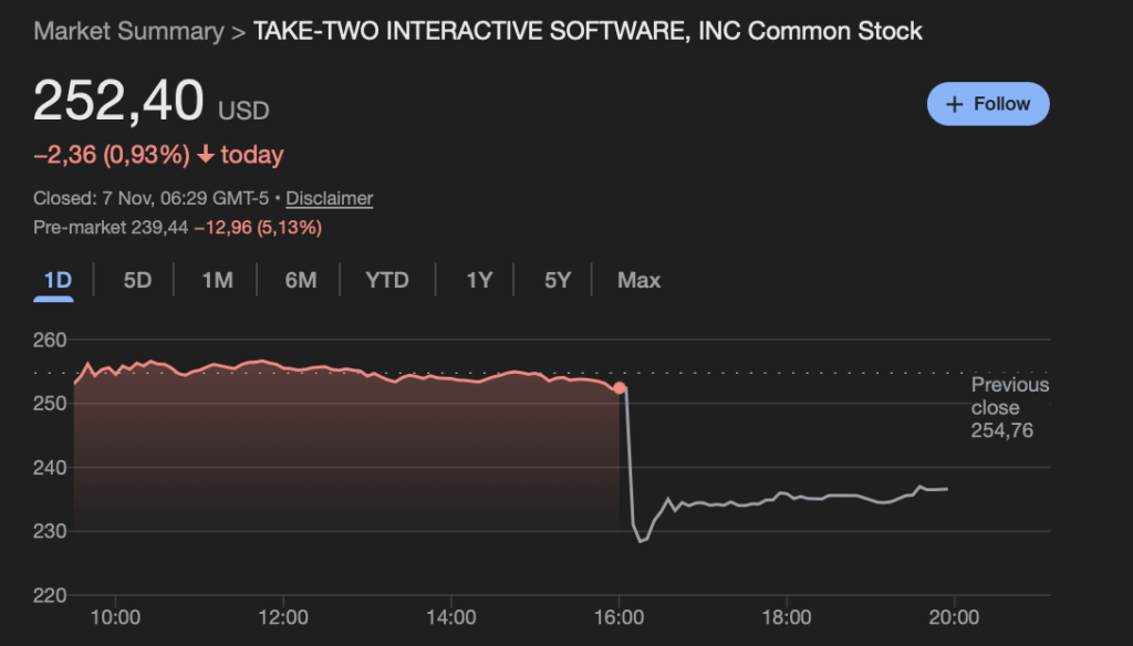 Notably, the update on the latest GTA triggered a sharp reaction in the market trading, with an initial drop of up to 18% after news of the delay circulated. Currently at the time of publication TTWO stock is down over 5% in pre-market.