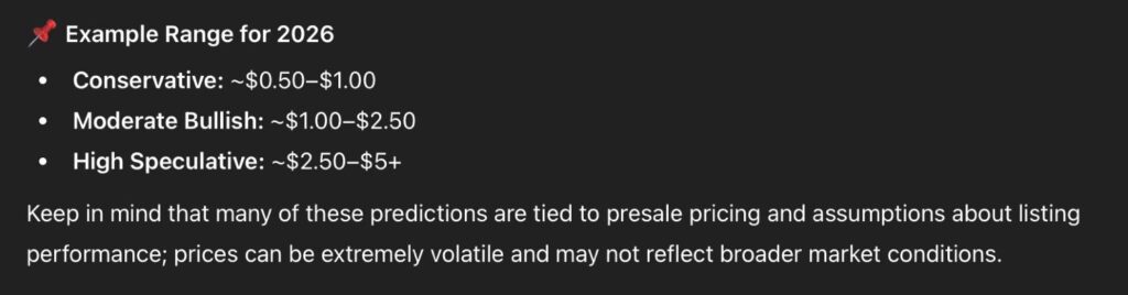 Tokens of this nature and at this stage are extremely volatile, and many never list or gain liquidity. Those that do, however, sometimes deliver outsized returns. Should it succeed, ChatGPT sees the OZ price potentially landing above $5 in 2026.